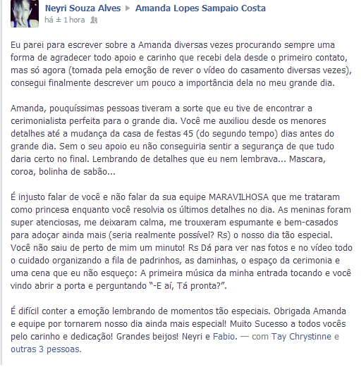 Nossa que equipe! O que seria de mim se não fosse voces!! Amanda muito obrigada pelo seu carinho, atenção, dedicação e profissionalismo... foi tudo tão perfeito.... muito mais do que eu sonhava!! Perfeitooooo!!!! não tenho palavras que possa dimensionaar a satisfação que voces nos proporcionaram.... o MUITO OBRIGADA nota 10 é pouco 1000000.... para voces!!!!!!!